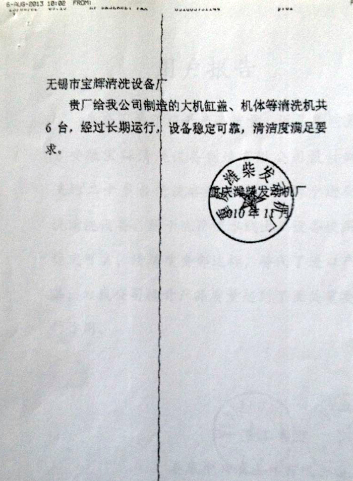 關(guān)鍵詞:重慶濰柴發(fā)動(dòng)機(jī)廠用戶報(bào)告  發(fā)布日期:2015-03-05  來(lái)源:安徽寶輝清洗設(shè)備制造有限公司